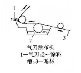 由單棍式輥紙徐布機和氣刀等組成的涂布機。涂布輥向基材涂布涂料,用氣刀噴出的氣流吹去過剩的涂料以調節涂層厚度,同時使涂料面光滑平整。適用于固體組成多、鉆度低的涂料,如水溶性涂料和有機溶膠。主要用于制造高級印刷紙、記錄紙、乳膠型感光紙等。